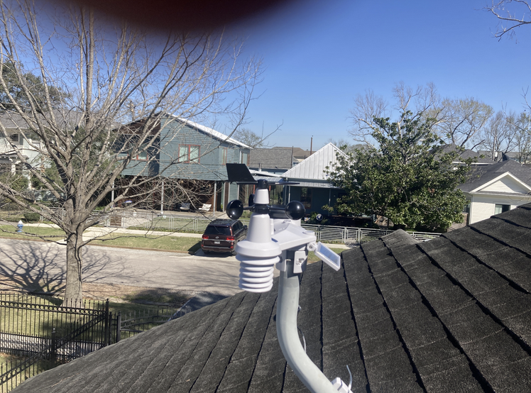 - The photo that would depict the southern horizon is missing. If it were available, it would likely show that the roof reaches a level higher than the station, blocking at least the airflow (if not also sunlight when the sun is low, for example). If the station were placed at the roof’s peak on a mast of at least 1.25 m, the roof would not have a significant impact on wind and temperature measurements.