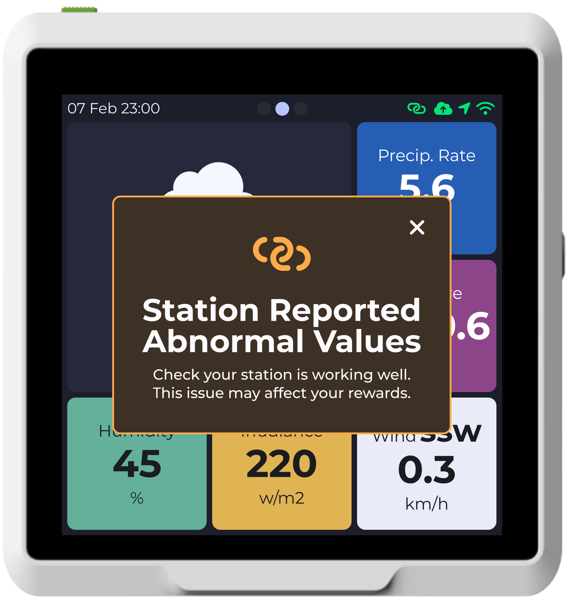 This message is displayed when the weather station reports values that are out of the ordinary. This can be due to a variety of reasons, such as: